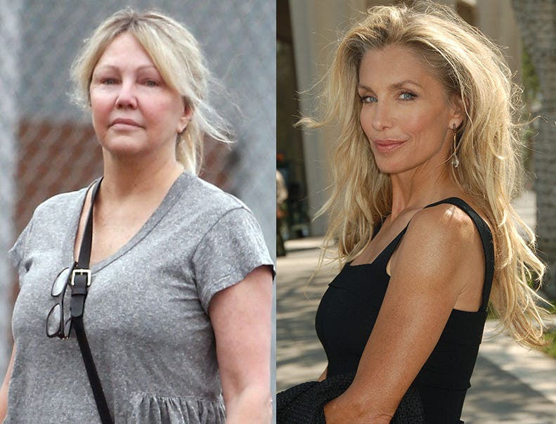 Compare the two headshots. Everything about Heather Thomas, on the right, is observably of higher quality than Heather Locklear on the left. Her hair is fuller, prettier, and better styled. Her eyes are bigger, brighter, and more striking. Her nose is much more refined - literally, as she had a very good nose job - and her smile is picture-perfect. Her cheekbones are more defined, as is her jaw; she observably has the bone structure of a 10 that always ages well.
