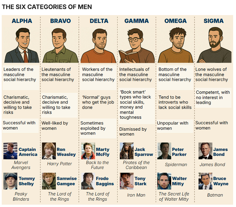 According to scientists, all men are either alphas, bravos, deltas, gammas, omegas, or sigmas.