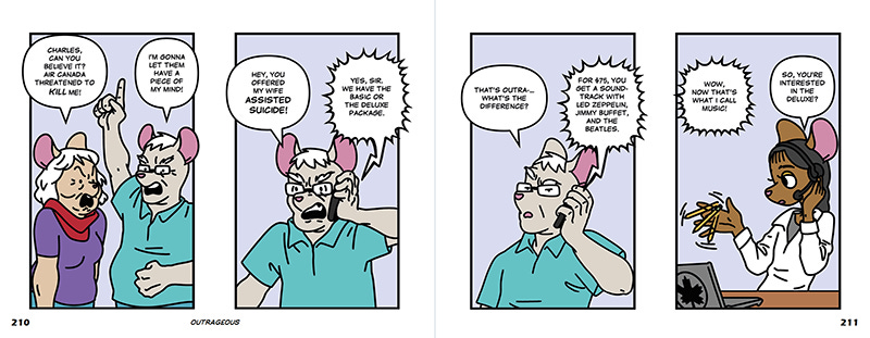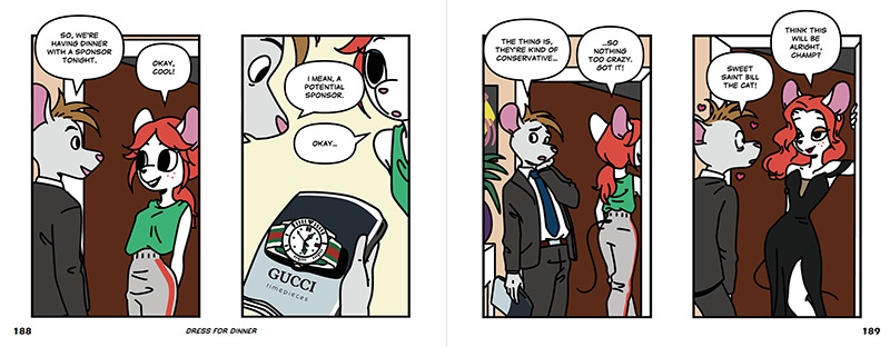 One of the elite rewards of the Hypergamouse campaign was the Coffee Table Book, which is a large horizontal edition with only two panels per page, thereby spreading out each episode to two pages and permitting larger panels and higher resolution art. This backer’s edition is now available at the Arkhaven store to those who missed the campaign for one week only and features the first 100 episodes of the popular comic as well as the nine episodes of the original black-and-white comic drawn by the original illustrator.