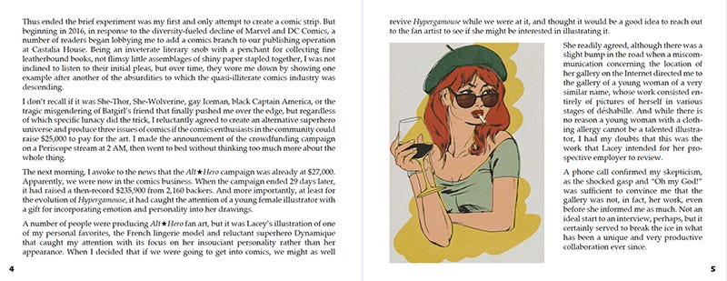 That’s why, although the coffee table book is 222 pages, the content is exactly the same as the 115-page hardcovers and paperbacks that have already shipped out to all of the backers, including both essays by Vox and Lacey. It also has the special gold Arkhaven logo that is reserved for first editions.