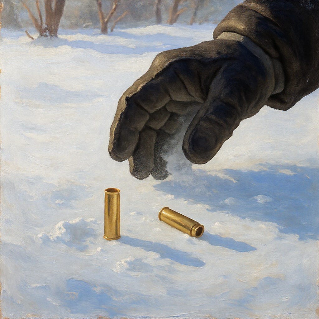 Once we dug down a bit, what was left of the scene told a violent story. There were dark red stains marked where something had bled heavily into the snow. And we dug up two brass shell casings, glinting gold in the morning sunlight.