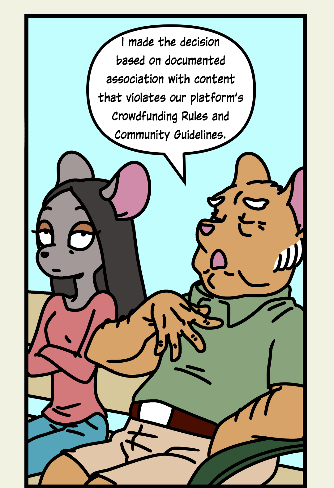 We are writing to inform you that after a thorough review of your project submission, BackerKit will not be able to approve your project “Hypergamouse Volume 1” for launch on our platform. This decision is based on documented association with content that violate our platform’s Crowdfunding Rules and Community Guidelines.