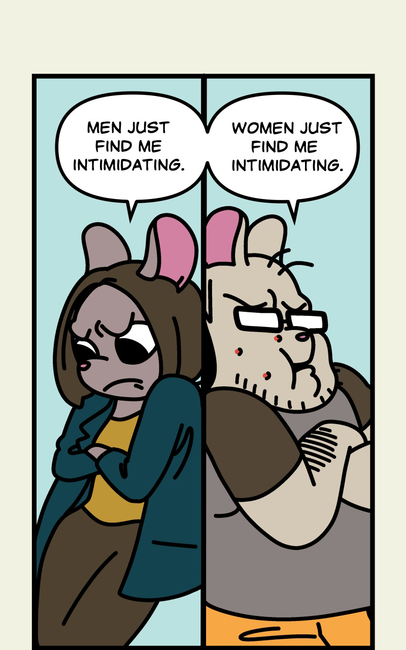 Never, in the entire history of the human race, has any man not been attracted to a woman because he is intimidated by her. Never, in the entire history of the human race, has a woman not been attracted to a man because she finds him too intimidating, regardless of the cause.
